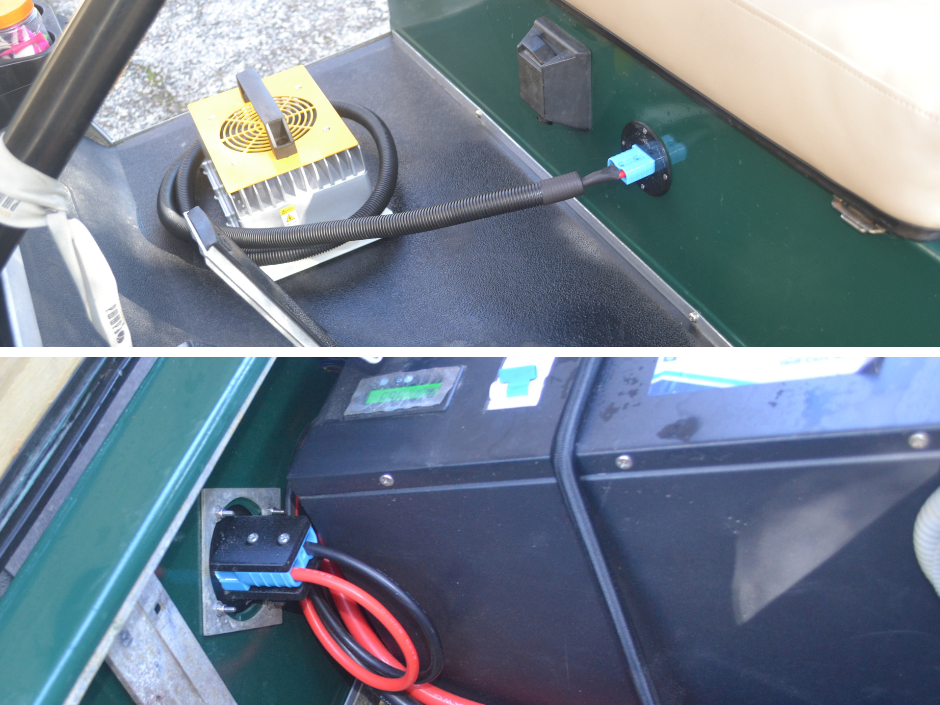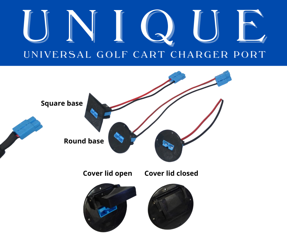 We have designed and developed our universal charging port to fit any model golf cart. This unit replaces the charging port on any model golf cart. Internally, it connects to the battery charge input; externally, the Smart Lithium Charger plugs into the charge port.